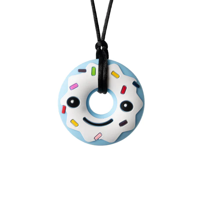 This chewable necklace features a donut-shaped silicone pendant made from non-toxic, durable silicone that’s gentle on teeth and gums yet resilient enough for repetitive chewing. Designed to be comfortable for all-day wear, it includes a breakaway safety clasp to reduce risk during play.